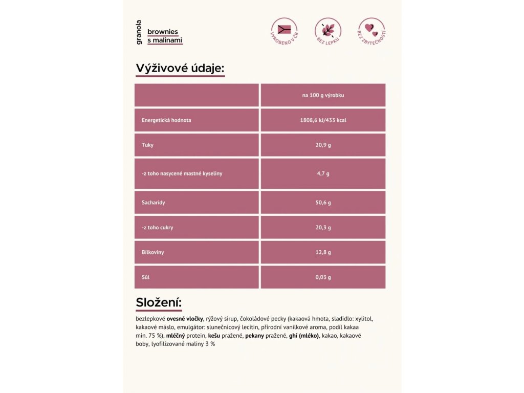 Složení: bezlepkové ovesné vločky, rýžový sirup, čokoládové pecky (kakaová hmota, sladidlo: xylitol, kakaové máslo, emulgátor: slunečnicový lecitin, přírodní vanilkové aroma, podíl kakaa min. 75%), mléčný protein, kešu pražené, pekany pražené, ghí (mléko), kakao, kakaové boby, lyofilizované maliny 3 %.