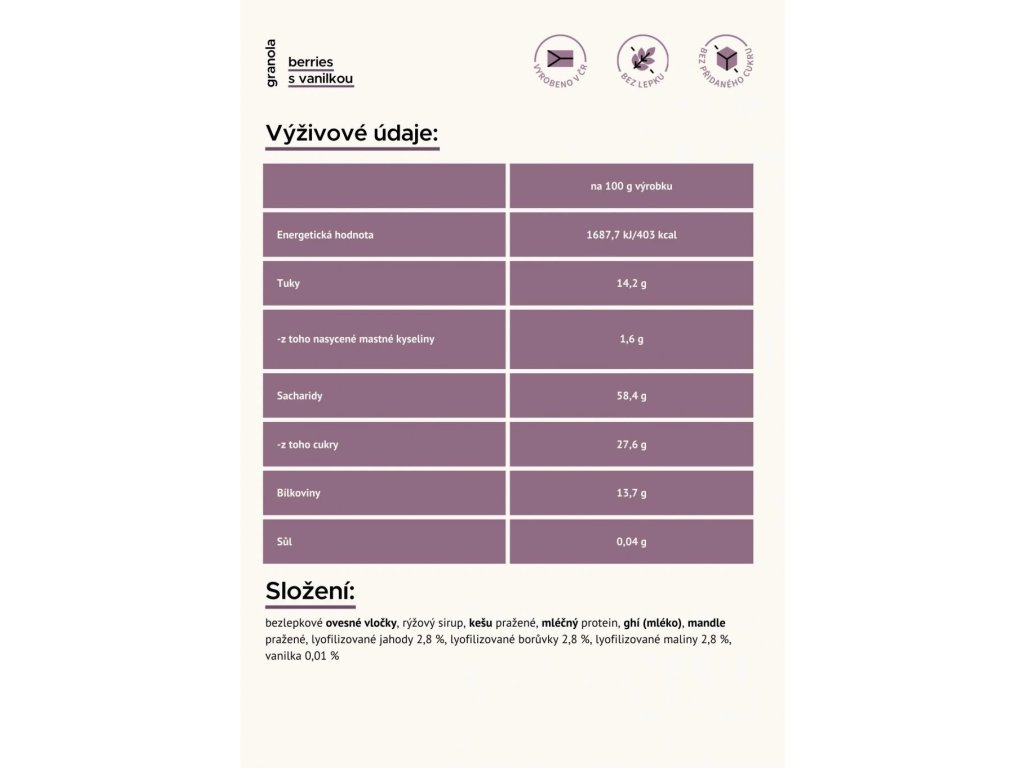 Složení: bezlepkové ovesné vločky, rýžový sirup, kešu pražené, mléčný protein, ghí (mléko), mandle pražené, lyofilizované jahody 2,8 %, lyofilizované borůvky 2,8 %, lyofilizované maliny 2,8 %, vanilka 0,01 %