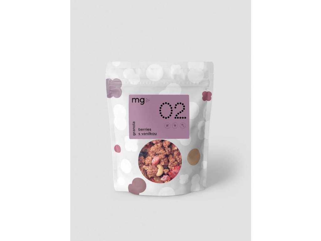 Užijte si harmonické propojení bezlepkových ovesných vloček, mandlí, kešu, mrazem sušených jahod, borůvek a malin. Granolu sladíme rýžovým sirupem a spojujeme prospěšným ghíčkem. Díky vyváženému poměru ovoce a vanilky má jemnou, neodolatelnou chuť. Na lžičku si díky ní naložíte pořádnou porci zdravých tuků a sacharidů. Dopřejte si ji s mlékem, jogurtem nebo kefírem, které zajistí bílkoviny a vytvoří z granoly vyváženou snídaňovou (nebo svačinovou) lahůdku.