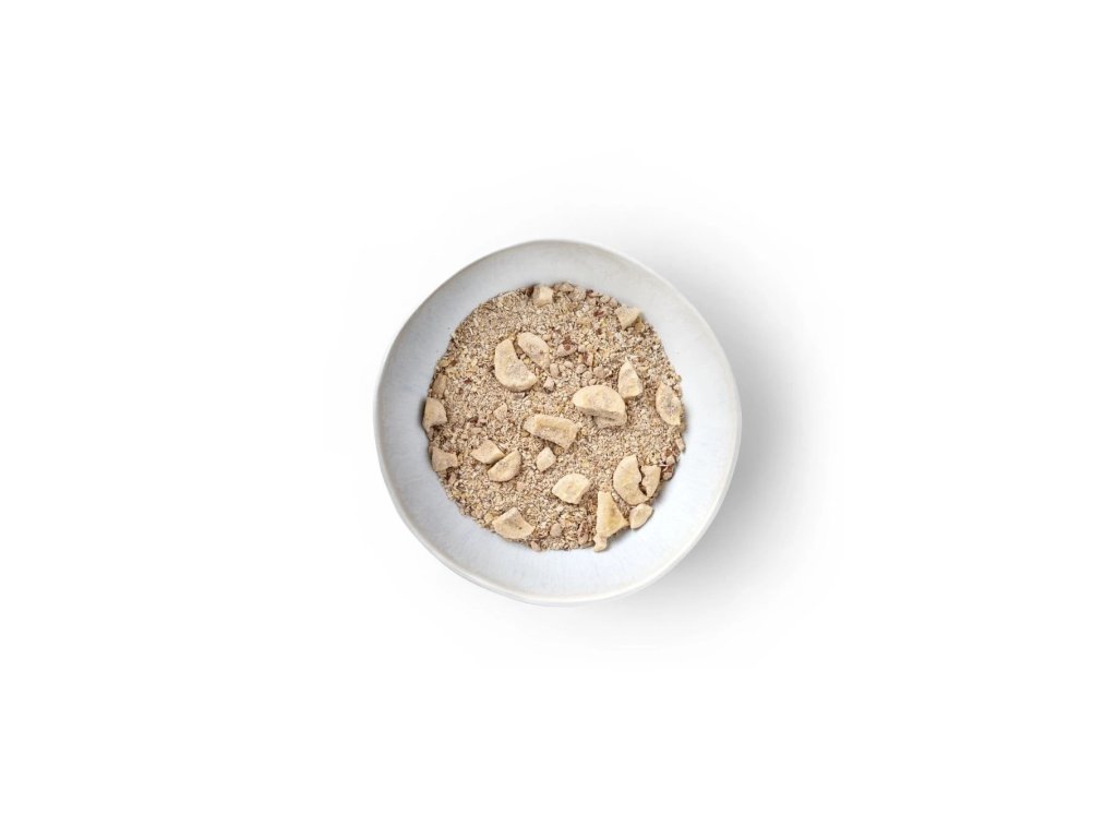 Tato kaše se zrodila z lásky k banánovému chlebíčku a ořechovému krému 05. Tušíme, že si vás podmaní po prvním soustu – stejně jako nás. Má příjemnou banánovou chuť, perfektní texturu a složení, které rozmazlí tělo. Ovesné vločky, pekany, lněná semínka, kokos, xylitol, skořice a vanilka jsou v ní v dokonalé chuťové i nutriční rovnováze.