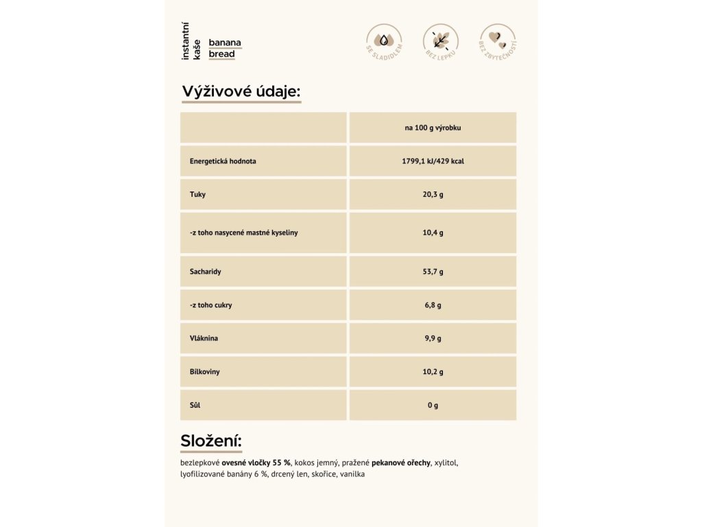 Složení: bezlepkové ovesné vločky 55 %, kokos jemný, pražené pekanové ořechy, xylitol, lyofilizivané banány 6 %, drcený len, skořice, vanilka