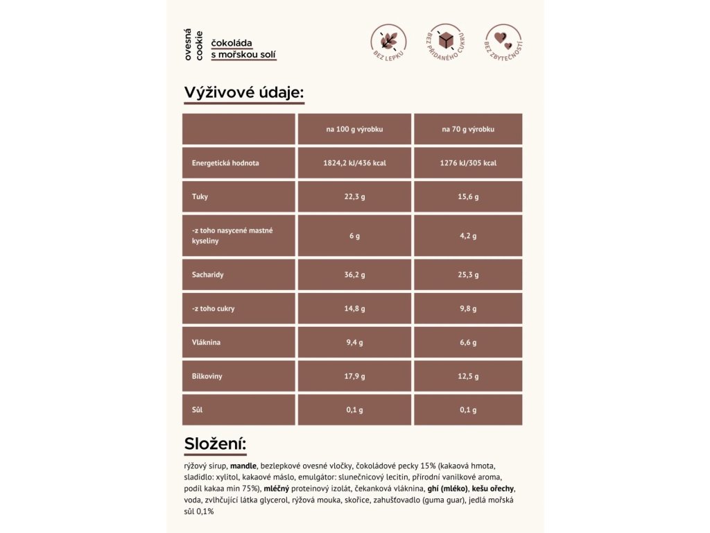 Složení: rýžový sirup, mandle, bezlepkové ovesné vločky, čokoládové pecky 15 % (kakaová hmota, sladidlo: xylitol, kakaové máslo, emulgátor: slunečnicový lecitin, přírodní vanilkové aroma; podíl kakaa min. 75 %), mléčný proteinový izolát, čekanková vláknina, ghí (mléko), kešu ořechy, voda, zvlhčující látka: glycerol, rýžová mouka, skořice, zahušťovadlo: guma guar, jedlá mořská sůl 0,1 %.