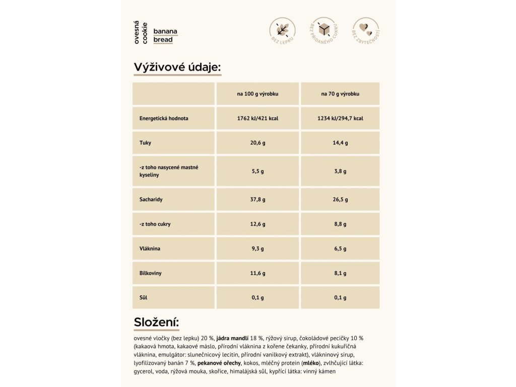 Složení: bezlepkové ovesné vločky 20 %, mandle 18 %, rýžový sirup, čokoládové pecičky 10 % (kakaová hmota, kakaové máslo, přírodní vláknina z kořene čekanky, přírodní kukuřičná vláknina, emulgátor: slunečnicový lecitin, přírodní vanilkový extrakt), vlákninový sirup, lyofilizovaný banán 7 %, pekanové ořechy, kokos, mléčný protein (mléko), zvlhčující látka: glycerol, voda, rýžová mouka, skořice, himalájská sůl, kypřicí látka: vinný kámen.
