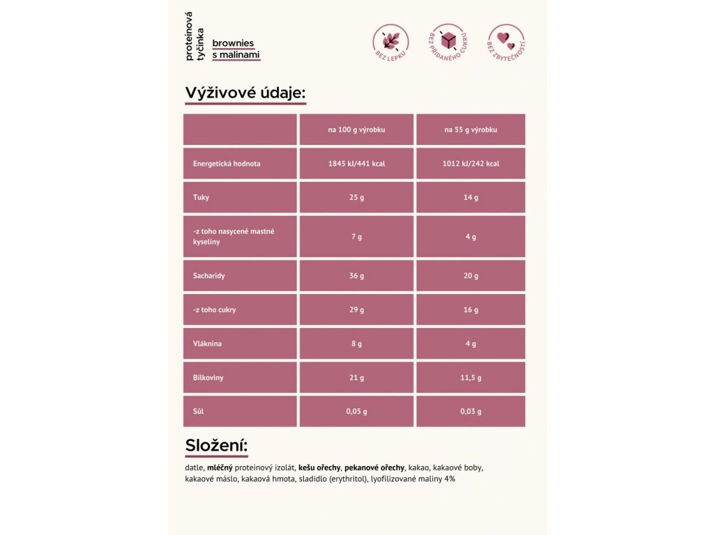 Složení: datle, mléčný proteinový izolát, kešu ořechy, pekanové ořechy, kakao, kakaové boby, kakaové máslo, kakaová hmota, sladidlo (erythritol), lyofilizované maliny 4%