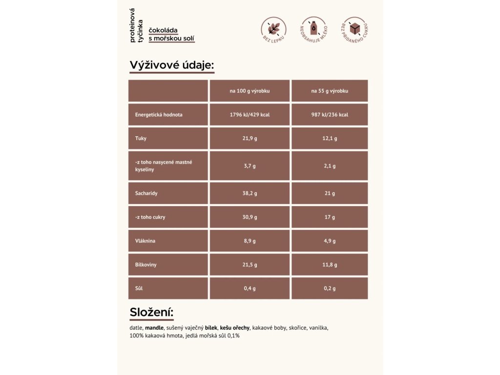 Složení: datle, mandle, sušený vaječný bílek, kešu ořechy, kakaové boby, skořice, vanilka, 100 % kakaová hmota, jedlá mořská sůl 0,1 %.